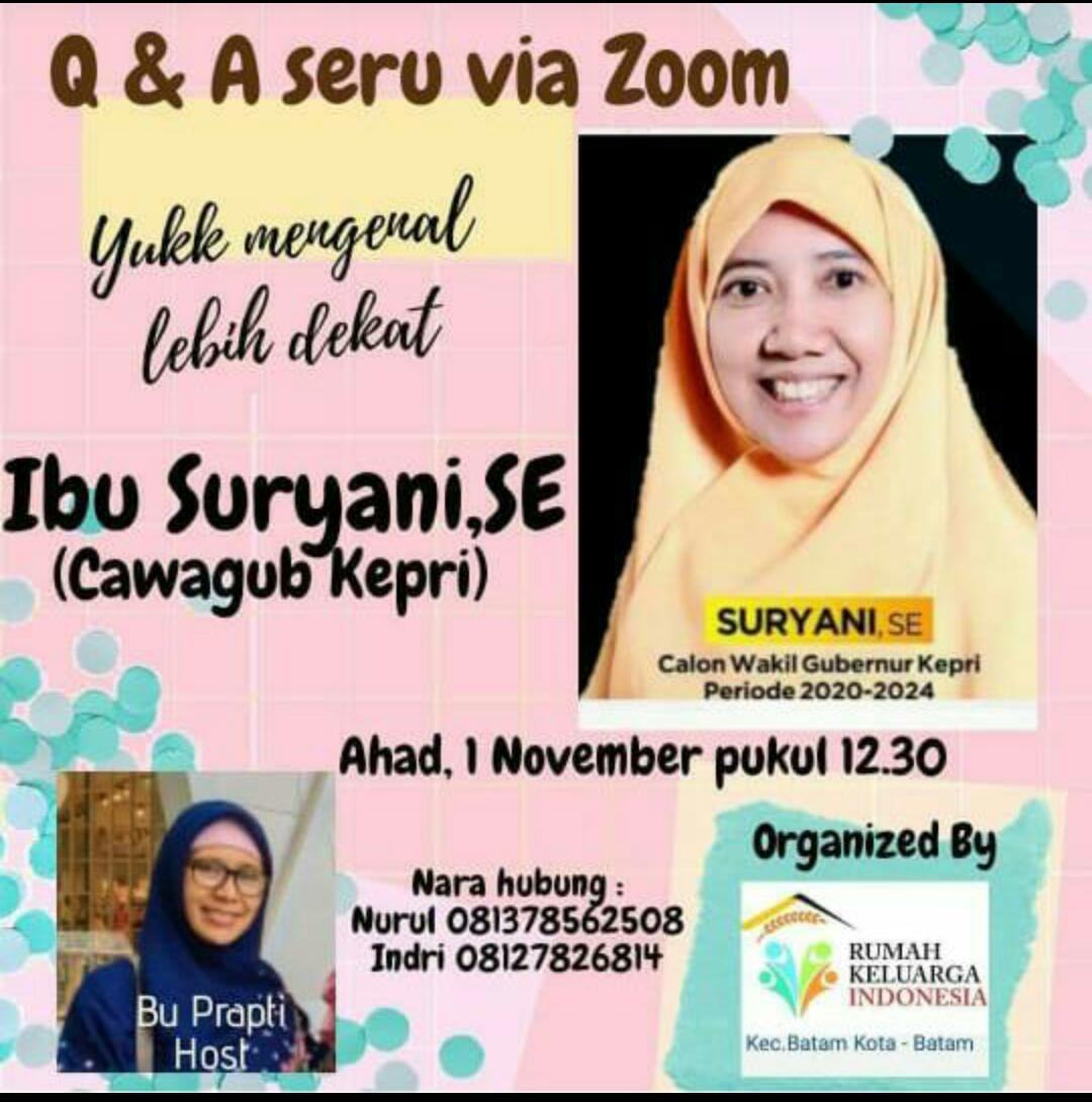 BATAM – Menyadari ditengah Pandemi Covid 19 ada begitu banyak keterbatasan untuk bertatap muka, sejumlah relawan yang terhimpun dalam Rumah Keluarga Indonesia menginisiasi program Q n A atau tanya jawab bersama Suryani Calon Wakil Gubernur Kepulauan Riau via zoom meeting.