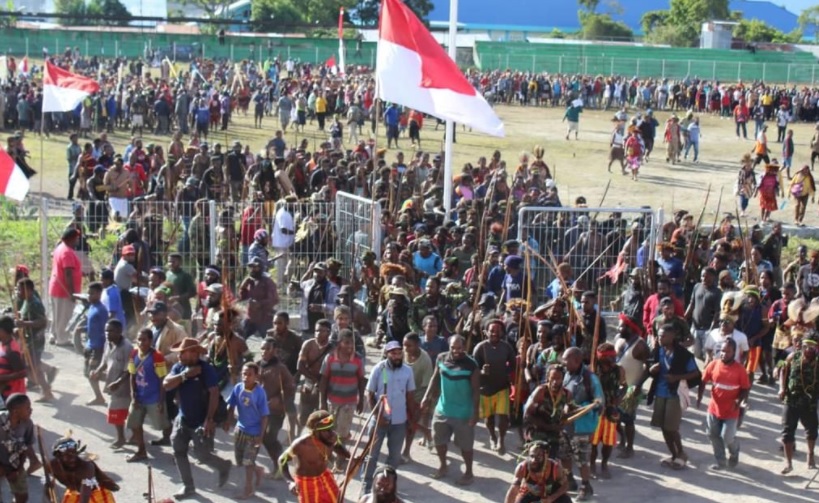 Jalannya kegiatan Deklarasi Papua Damai yang bertajuk “Merajut Persatuan Menepis Perbedaan Membangun Papua Damai Mengejar Kesejahteraan Berbasis Adat” diawali dengan pertunjukan tari perang oleh masyarakat Kab. Jayawijaya, dilanjutkan dengan sambutan ketua LMA Kabupaten Jayawijaya Herman Doga.