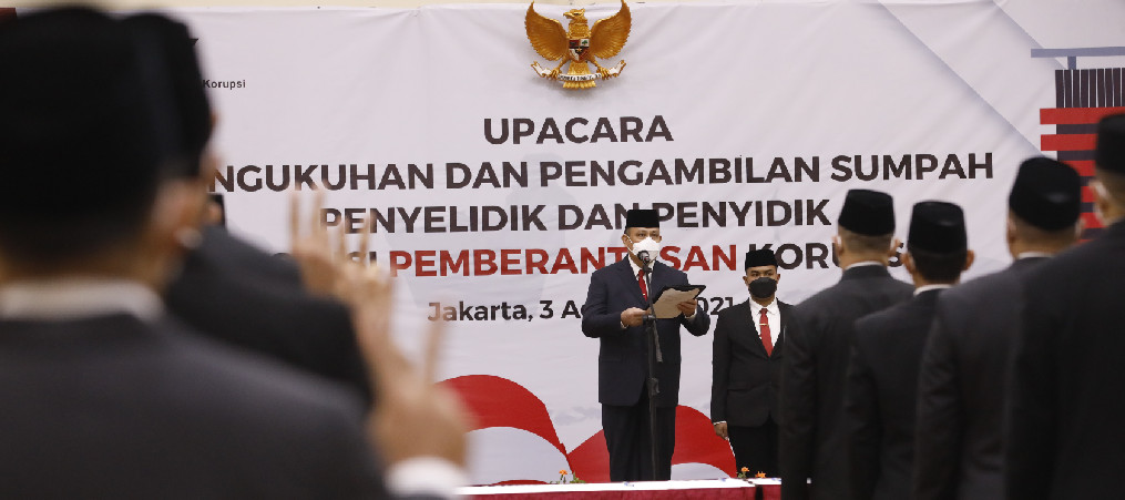 JAKARTA – 190 Penyelidik dan Penyidik KPK dikukuhkan dan disumpah diacara pengukuhan yang digelar di Aula Gedung Juang Merah Putih, Selasa (3/8/2021).