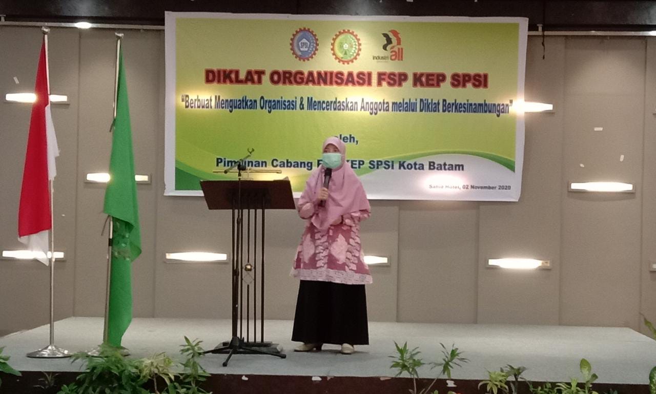 BATAM — Senin (2/11/2020) Suryani menghadiri undangan untuk memberikan sambutan dan motivasi serta masukan pada pembukaan Diklat (Pendidikan dan Latihan) SPKEP SPSI (Serikat Prima Kimia, Energi dan Pertambangan Serikat Pekerja Seluruh Indonesia) Kota Batam di Hotel Sahid Batam.