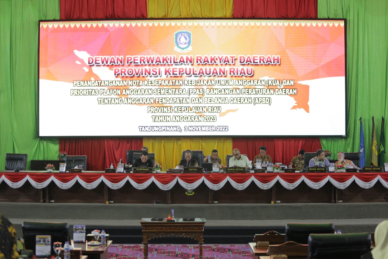TANJUNGPINANG – DPRD Provinsi Kepulauan Riau menyelenggarakan Rapat Paripurna Penandatanganan Nota Kesepakatan Kebijakan Umum Anggaran (KUA) dan Prioritas Plafon Anggaran Sementara (PPAS) Rancangan Peraturan Daerah tentang Anggaran Pendapatan dan Belanja Daerah (APBD) Provinsi Kepulauan Riau Tahun Anggaran 2023.