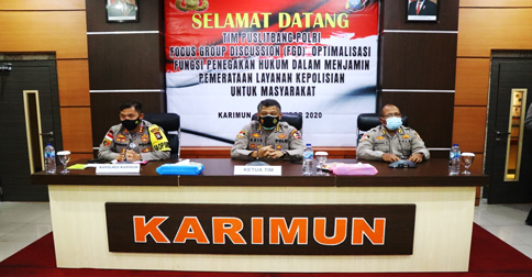 Melalui kegiatan focus group discussion (FGD) yang dilaksanakan di Rupatama Mapolres Karimun, Polda Kepri, Tim Puslitbang Polri, melaksanakan giat penelitian tentang optimalisasi fungsi penegakan hukum dalam menjamin pemerataan layanan kepolisian untuk masyarakat.