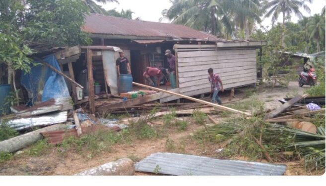 LINGGA– Satu unit rumah hancur, akibat angin kencang, yang mengakibatkan pohon kelapa tumbang menyebabkan rumah seorang janda anak empat hancur. Senin (05/04/2021)