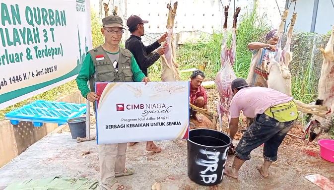 BATAM — Suasana hari raya Idul Adha yang penuh dengan gema takbir dan tahmid dimanfaatkan DT Peduli Kepri untuk menyalurkan amanah dari Bank CIMB Niaga Syariah Batam. Pada momen tersebut, dilakukan penyembelihan hewan kurban sebanyak 5 ekor kambing.