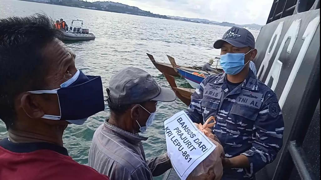 BATAM – Puluhan nelayan yang sedang mencari ikan di sejumlah titik di Batam tiba-tiba didatangi KRI Lepu-861, Minggu (8/8/2021). Kedatangan kapal Lepu-861 dari unsur Satrol Lantamal IV BKO Guskamla Kormada I ini untuk membagi-bagikan sembako ke nelayan yang sedang melaut. Pembagian sembako ini merupakan bantuan di masa pandemi Covid-19 dan dalam rangka Peringatan HUT ke-76 RI.