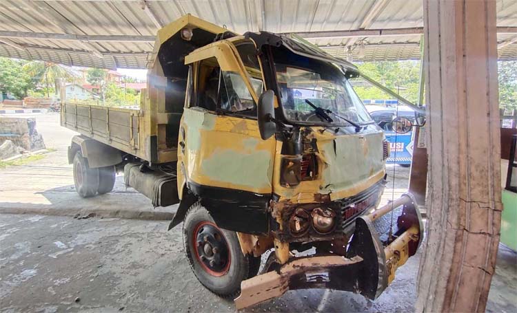 Akibatnya, dump truck mengalami kerusakan cukup berat bagian depan dan satu tiang fondasi rumah warga juga hampir ambruk.