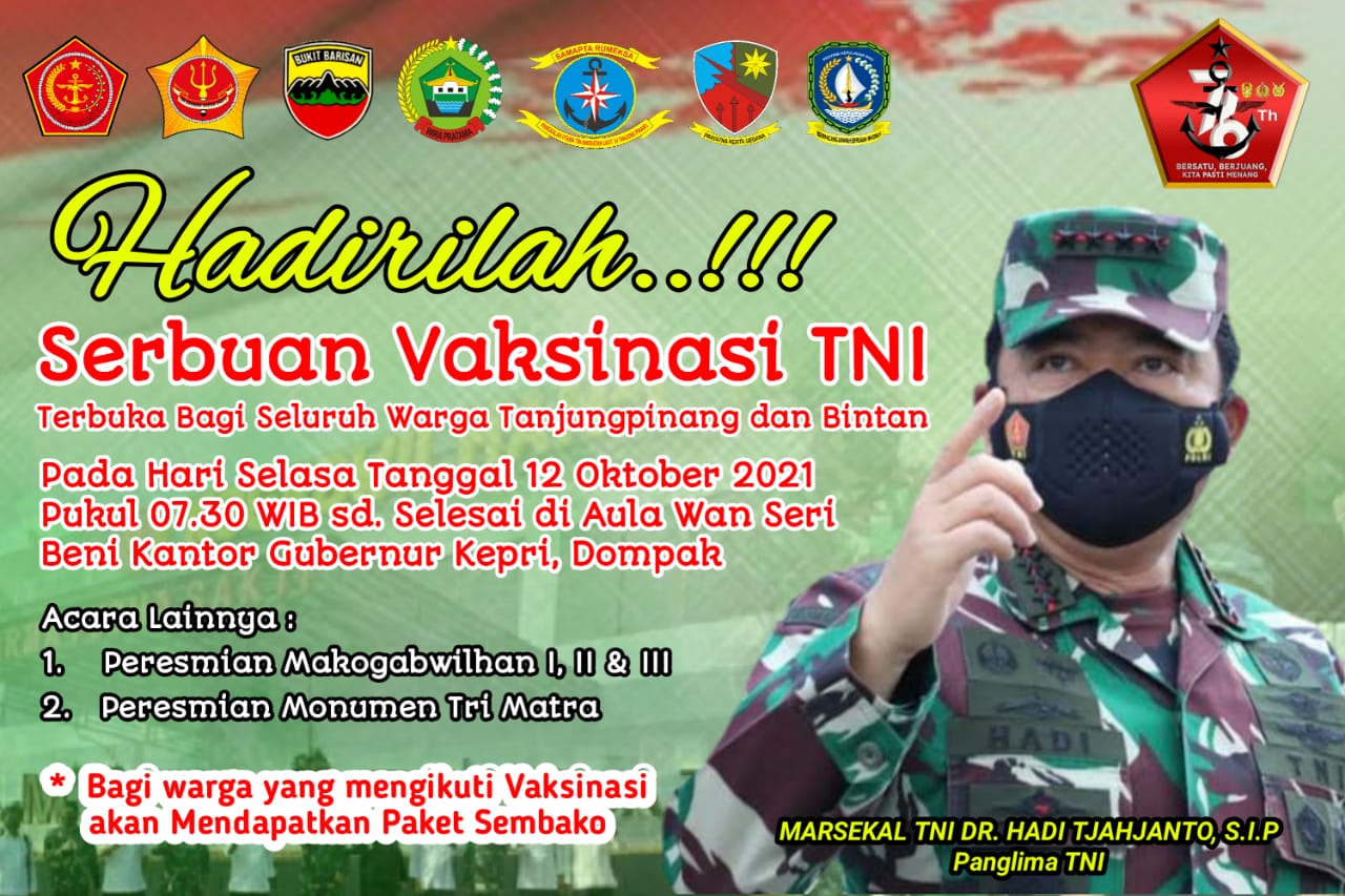 TANJUNGPINANG – Program Serbuan Vaksinasi Massal TNI yang akan digelar di Aula Wan Seri Beni Kantor Gubernur Kepri, Pulau Dompak pada Selasa 12 Oktober 2021 bakal lebih ramai pengikutnya. Usai pelaksanaan vaksin akan ada bagi-bagi sembako.