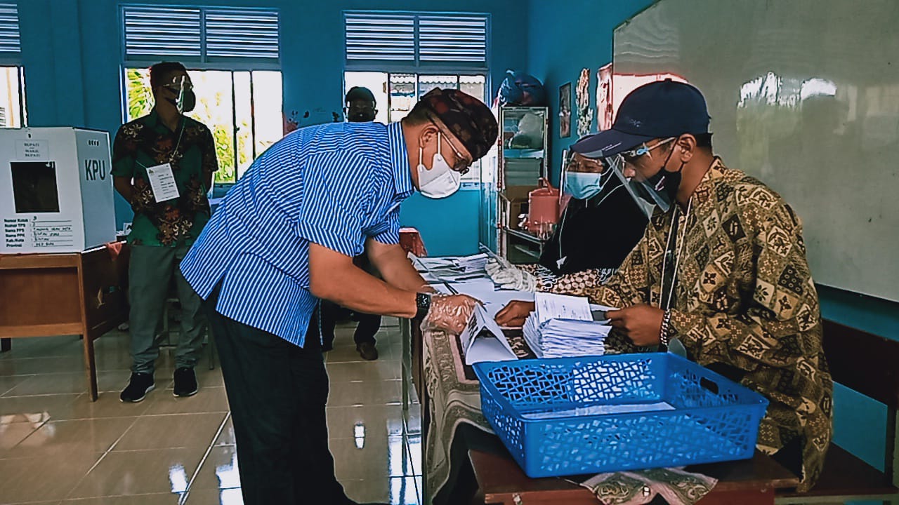 Usai mencoblos, AWe berjalan ke kotak suara dan memasukkan surat suara ke kotak suara untuk bupati / wakil bupati Bintandan gubernur / wakil gubernur Kepri.