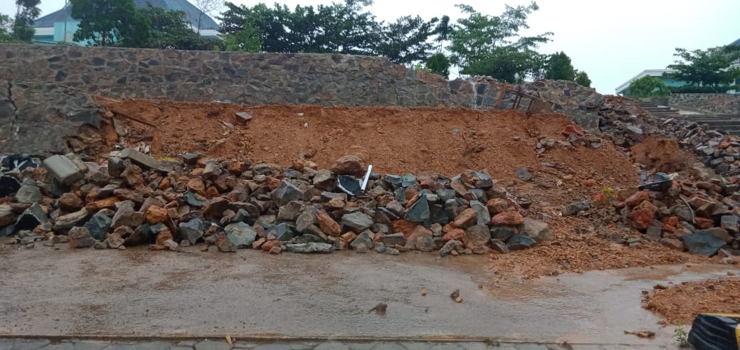 TANJUNGPINANG – Hujan berkepanjangan yang terjadi di Kepri belakangan tidak hanya memicu banjir. Longsor juga banyak terjadi. Bahkan, batu miring di Kampus Universitas Maritim Raja Ali Haji (UMRAH) ikut ambruk. Padahal, pembangunan batu miring di Kampus UMRAH ini baru selesai akhir 2020 lalu. Anehnya, meski batu miring ketinggiannya lebih dari tiga meter dan panjangnya puluhan meter, namun tidak ada pondasi hingga mudah ambruk.