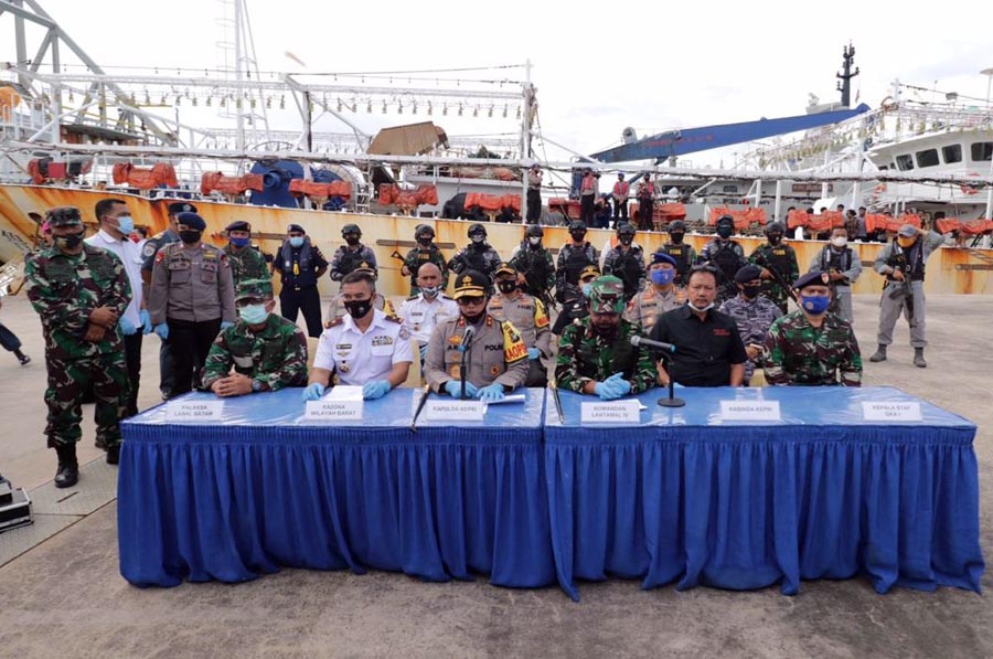 ”Untuk itu kami saling bersinergi, saling membantu dalam mengamankan kapal ini, termasuk juga tim Brimob kita terjunkan,” jelas Kapolda Kepri.