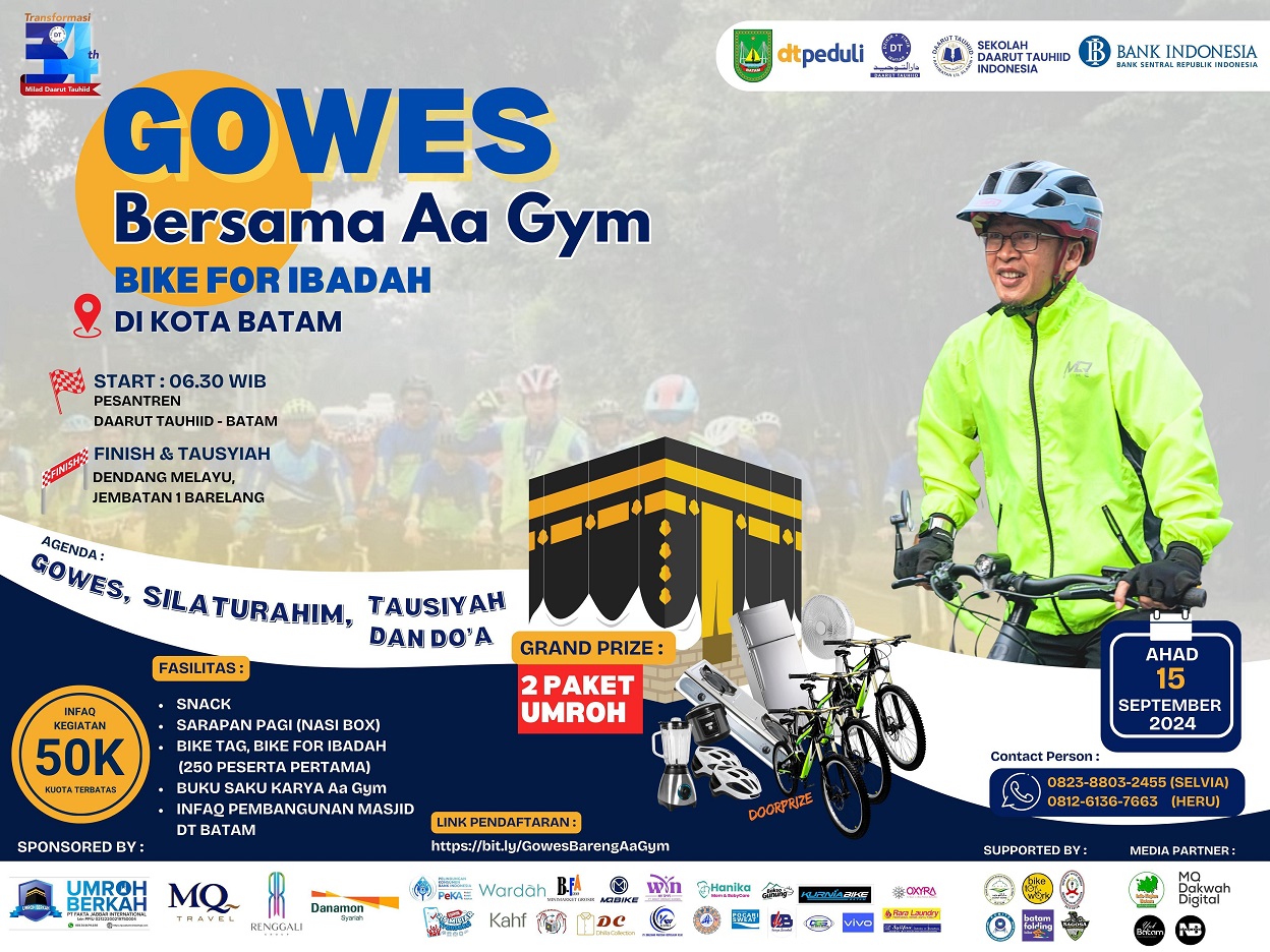 BATAM – Dalam rangka memperingati Milad Daarut Tauhiid yang ke-34, Pesantren Daarut Tauhiid Batam akan menyelenggarakan acara “Gowes Bersama K.H. Abdullah Gymnastiar” atau yang lebih dikenal dengan Aa Gym. Acara ini mengusung tema “Bike For Ibadah” yang akan disertai dengan kegiatan silaturahim, tausiyah, dan doa bersama.