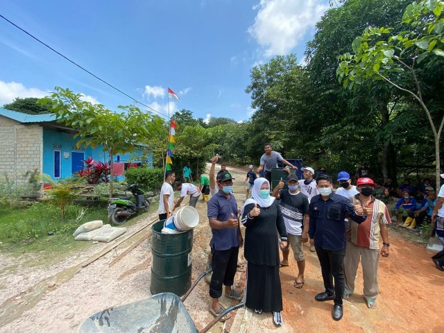BATAMCLICK.COM: HJ MARLIN Agustina Rudi gotong royong bersama warga Tembesibengkel, Kecamatan Batuaji, Minggu (9/8/2020) pukul 09.00 WIB.