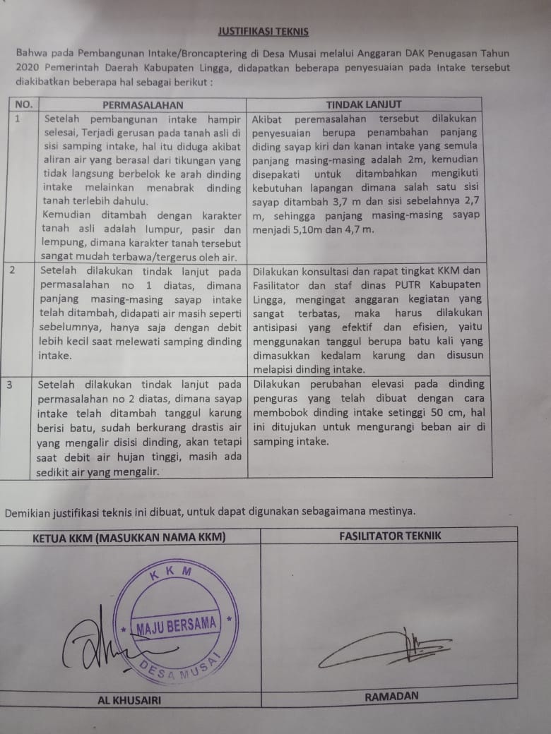Intake cadangan ini diselesaikan pada Desember 2020 dan sudah diserah terima dari pihak Dinas PUTR kepada KKM desa Musai.