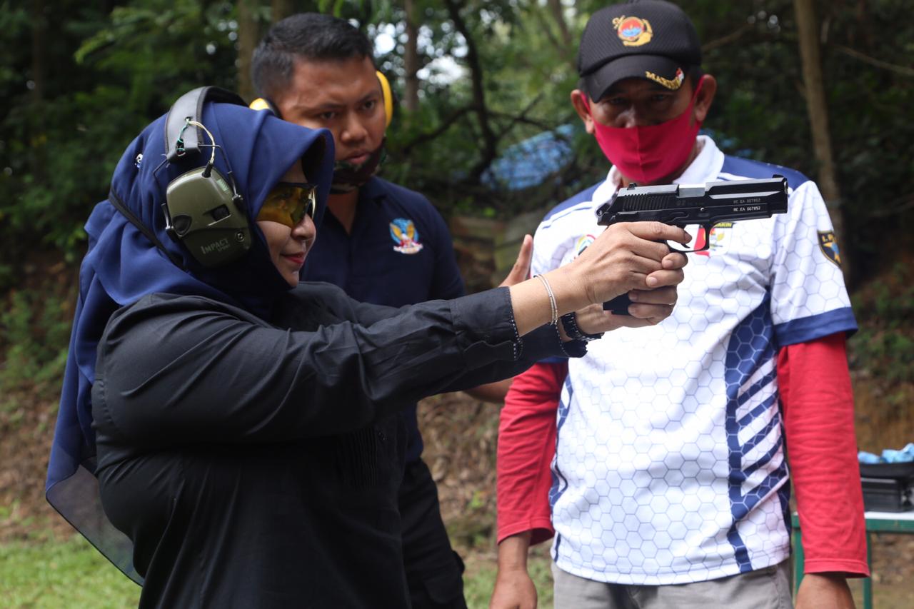 TANJUNGPINANG, – – Pelaksana Tugas (Plt) Wali Kota Tanjungpinang, Hj. Rahma latihan menembak bersama Persatuan Olahraga Menembak dan Berburu Indonesia (Perbakin) Kota Tanjungpinang. Rahma yang mengenakan jilbab biru dan berkacamata itu mencoba mengasah kemampuan menembaknya di lapangan tembak Danyonmarhanlan IV, Jalan Ciku, Tanjungpinang, Sabtu (11/7) pagi.