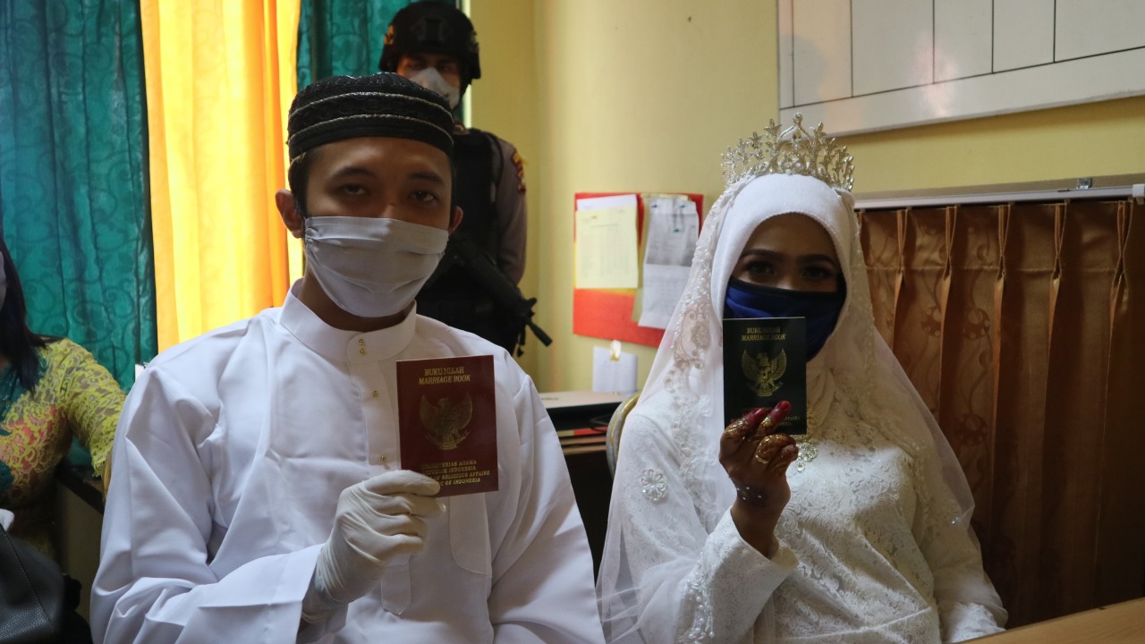 Usai melangsungkan pernikahan, kedua mempelai langsung menunjukkan buku nikahnya, kemudian menyalami keluarga masing-masing dan aparat kepolisian. (Mn/Sijoritoday.com)