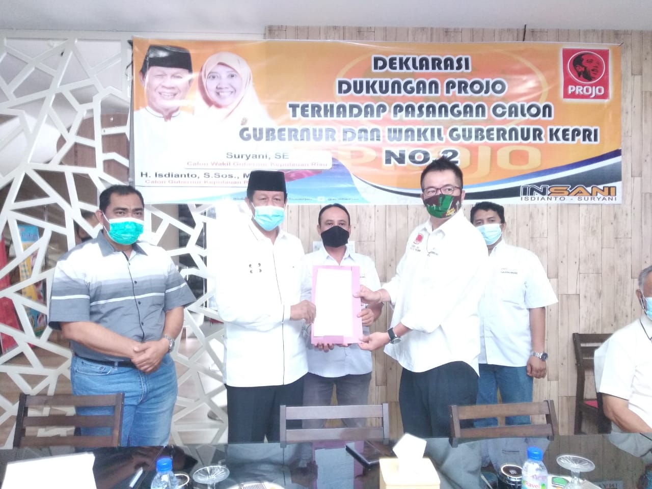 TANJUNG PINANG – Organisasi Masyarakat Pro Joko Widodo (ProJo) Provinsi Kepulauan Riau resmi memberikan dukungan kepada pasangan calon Gubernur dan Wakil Gubernur Kepri, Isdianto-Suryani (INSANI).