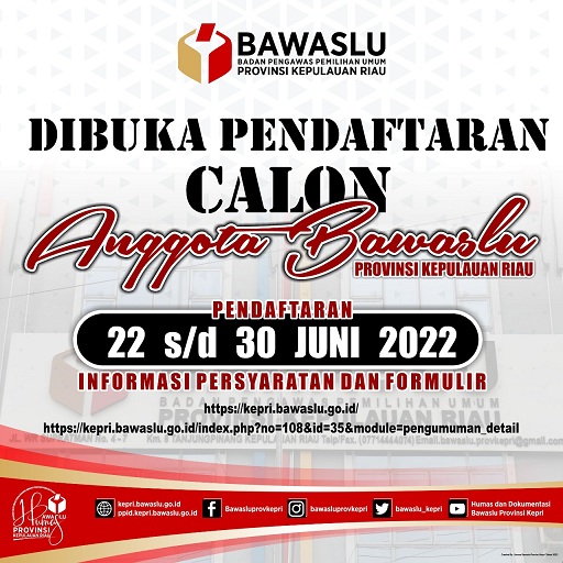 KEPRI – Tim Seleksi Calon Anggota Bawaslu Provinsi Kepulauan Riau resmi menyampaikan Pengumuman pendaftaran bakal calon anggota Bawaslu Provinsi.