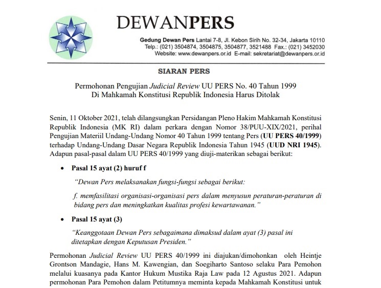 MK sudah mulai menyidangkan perkara uji materil ini pada Senin (11/10/2021). Beberapa pasal-pasal dalam UU PERS 40/1999 yang diuji-materikan di antaranya fungsi Dewan Pers seperti yang tertuang pada Pasal 15 ayat (2) huruf f yang isinya “memfasilitasi organisasi-organisasi pers dalam menyusun peraturan-peraturan di bidang pers dan meningkatkan kualitas profesi kewartawanan.”