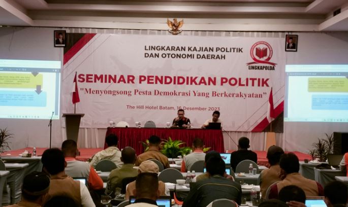 BATAM – Seminar pendidikan politik yang ditaja Lingkaran Kajian Politik dan Otonomi Daerah (Lingkapolda) berjalan sukses dan lancar. Ratusan peserta hadir dan tampak antusias mengikuti kegiatan yang diselenggarakan pada Sabtu (16/12/2023) di Hotel The Hill Batam, Kepri tersebut.