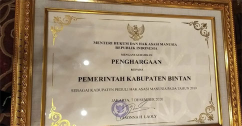 BATAMCLICK.COM, Bintan – Kementerian Hukum dan Hak Asasi Manusia (Kemenkumham) kembali memberikan penghargaan kepada Pemkab Bintan sebagai kabupaten/kota peduli HAM tahun 2020.