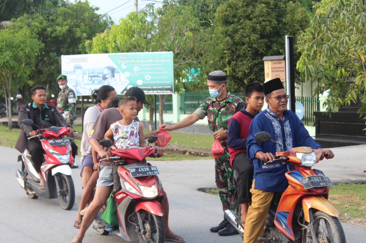 KARIMUN – Prajurit TNI di Kodim 0317/Tanjung Balai Karimun bagi-bagi takjil di jalan Jendral Sudirman Poros Kelurahan Pamak, Tebing, Karimun Minggu (17/4/2022).