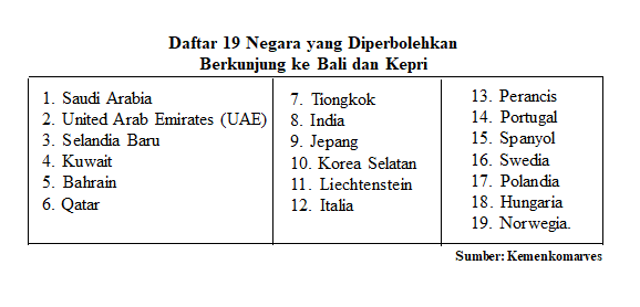 Menteri Koordinator Bidang Kemaritiman dan Investasi, Luhut Binsar Pandjaitan menumumkan, bahwa ada 19 negara yang nantinya diizinkan masuk ke Indonesia.