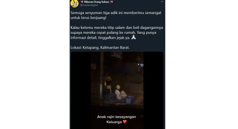 “Semoga senyuman tiga adik ini memberimu semangat untuk terus berjuang! Kalau ketemu mereka titip salam dan beli dagangannya supaya mereka cepat pulang ke rumah. Yang punya informasi detail, tinggalkan jejak ya,” tulis keterangan di caption.