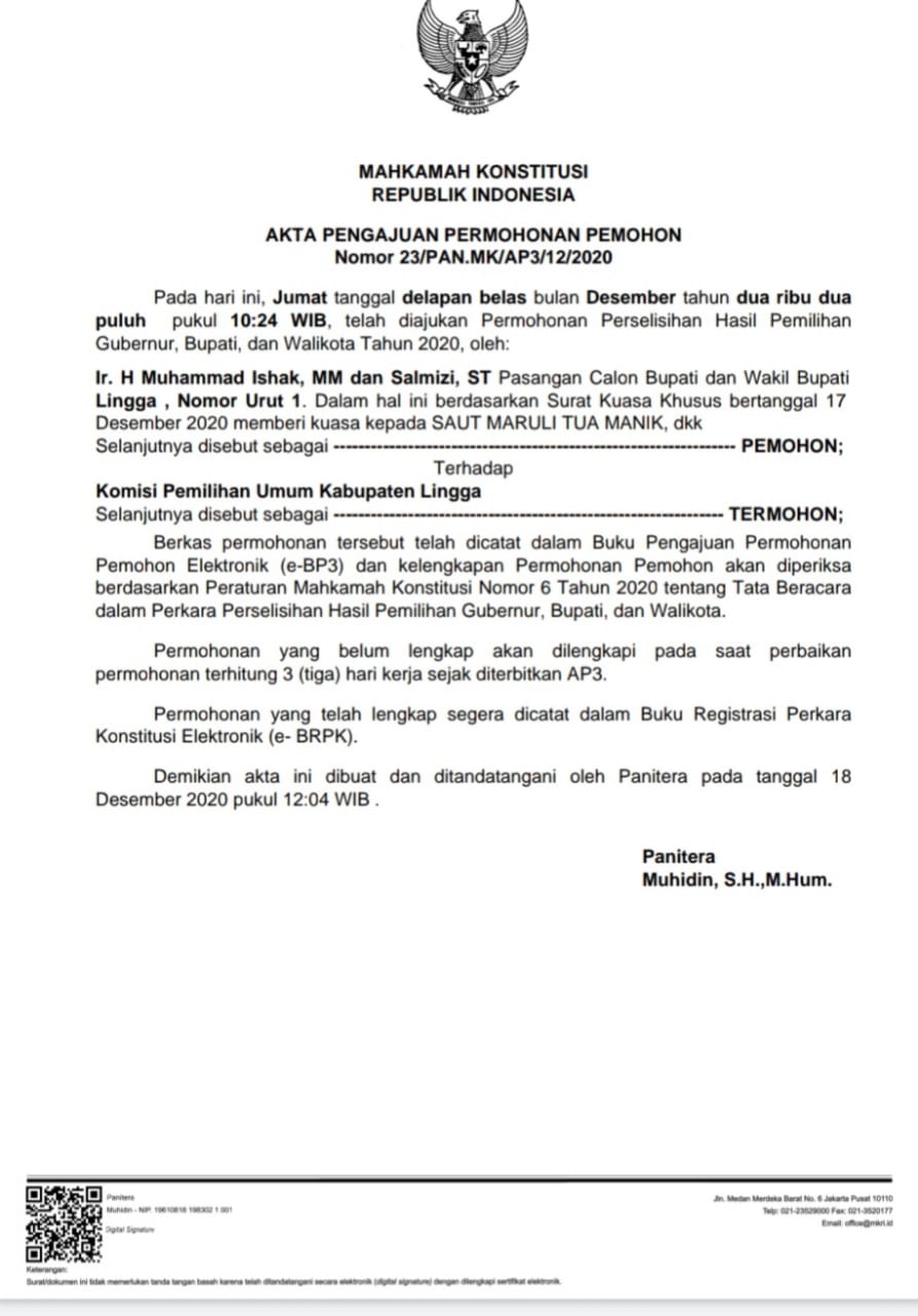 Berdasarkan akta PHP tersebut permohonan gugatan sengketa Pilkada Lingga diajukan Ishak-Salmizi pada Jumat tanggal 18 Desember 2020 Pukul 12.04.