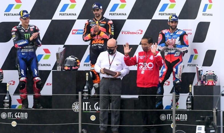Sebelumnya, Presiden Jokowi turut naik ke podium untuk menyerahkan trofi kepada para pemenang pada gelaran bertajuk Pertamina Grand Prix of Indonesia tersebut. Miguel Oliveira, pembalap tim Red Bull KTM Factory Racing, berhasil menjadi juara setelah menyelesaikan balapan 20 lap dengan waktu 33 menit 27.2230 detik.