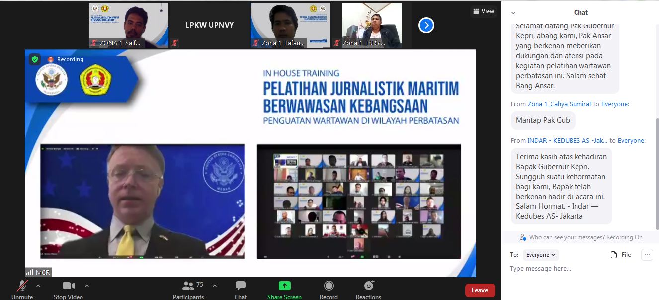 Pelatihan wartawan perbatasan yang digelar oleh Lembaga Penguji Kompetensi Wartawan (LPKW) UPN ‘Veteran Yogyakarta bekerjasama dengan Kedutaan Besar (Kedubes) AS di Indonesia itu juga menghadirkan Gubernur Kepri, H. Ansar Ahmad sebagai keynote speaker, Rektor UPN ‘Veteran’ Yogyakarta, Dr M Irhas Effendi, M.SI, Kadis Kominfo Kota Batam, Azril Apriansyah, Kapolda Kepri yang diwakili Bidang Humas Polda Kepri, Humas Badan Pengusahaan (BP) Batam dan sejumlah tokoh lain di Kepri.