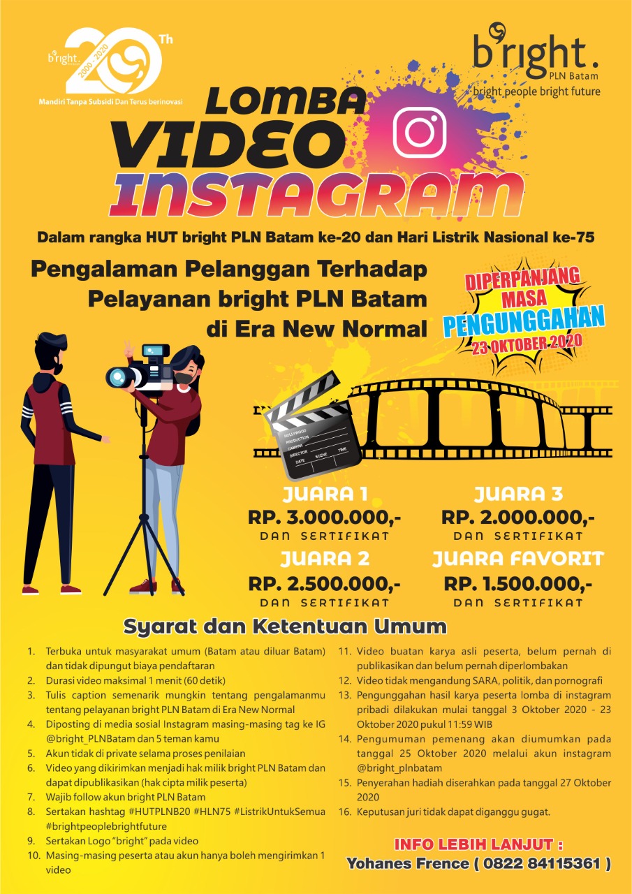 Seperti yang diberitakan sebelumnya bahwa dalam rangka HUT Bright PLN Batam yang jatuh tanggal 3 Oktober 2020 dan Hari Listrik Nasional ke-75 pada tanggal 27 November nanti. Bright PLN Batam menggelar lomba menulis feature khusus Jurnalis dan Lomba Video Instagram.