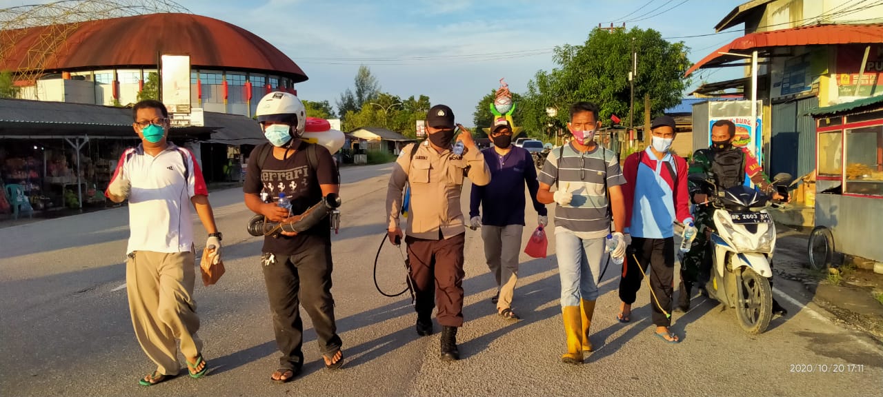 Bersama Bhabinsa dan Bhabinkamtibmas, warga bersama-sama melakukan penyemprotan desinfektan dari rumah ke rumah atau door to door, Selasa (20/10/2020) tadi sore.