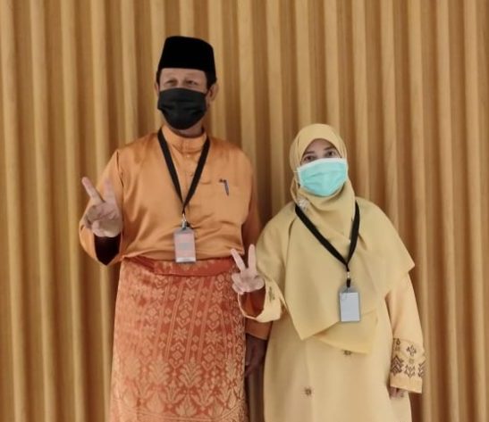 Sedangkan Suryani, memakai pakaian baju kurung berwarna kuning.
