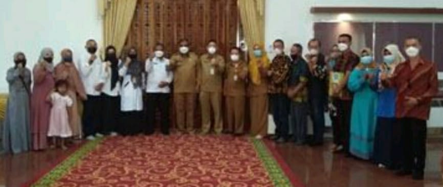 Pelaku UMKM foto bersama dengan Bupati Karimun, Aunur Rafiq di dampingi Kepala Dinas Tenaga Kerja Perindustrian Ruffindy Alamsjah, Sekretaris Disnakerprin Raja Jemishak, Ibu Kabid Fuji, KTU Kakanwil Kemenag H Abu Sufyan dan staff di Kediaman Bupati Karimun, Senin (21/2/2022).
