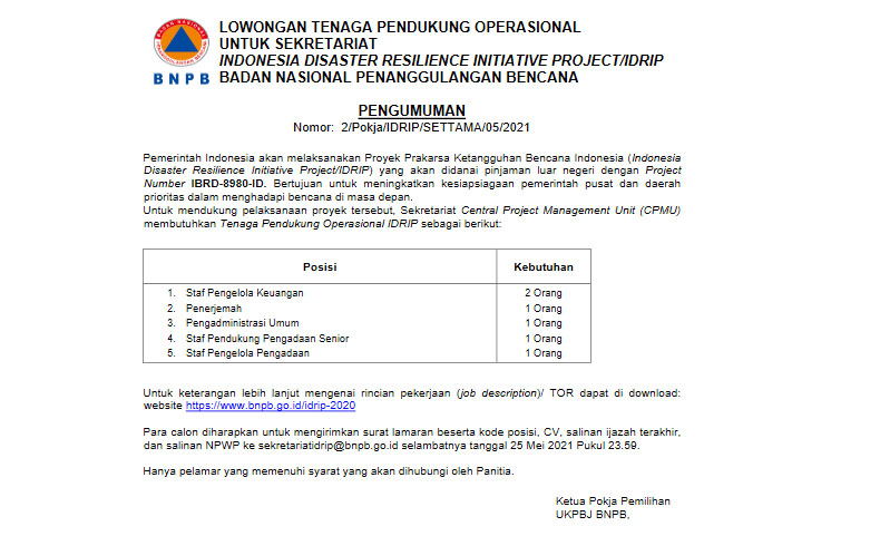 Pada pengumuman bernomor 2/pokja/DRIP/SETTAMA/05/2021 itu disebutkan, pendaftar yang memenuhi kualifikasi akan dipekerjakan dalam kegiatan pelaksanaan poyek Prakarsa Ketangguhan Bencana Indonesia. Dananya akan dibiayai pinjaman luar negeri.