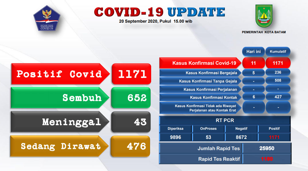 BATAM – Angka warga Batam yang menderita Covid-19 cukup tinggi. Sampai saat ini tercatat ada 1.171 kasus Covid di Batam. Saat ini masih ada 476 orang yang dirawat di berbagai rumah sakit. Angka kematian pasien positif Covid-19 di batam tercatat mencapai 43 orang sementara yang sembuh sudah 652 orang. Mayoritas warga yang positif Covid-19 di batam dirawat di RSKI Pulang Galang, Barelang Batam. Penambahan kasus Covid-19 di Batam masih tinggi setiap harinya. Hal ini membuat Pemko batam berinisiatif untuk memberlakukan status Pembatasan Sosial Berskala Besar (PSBB) yang sebelumnya belum pernah dilakukan di Batam. Kali ini, wacana memberlakukan PSBB muncul lagi.