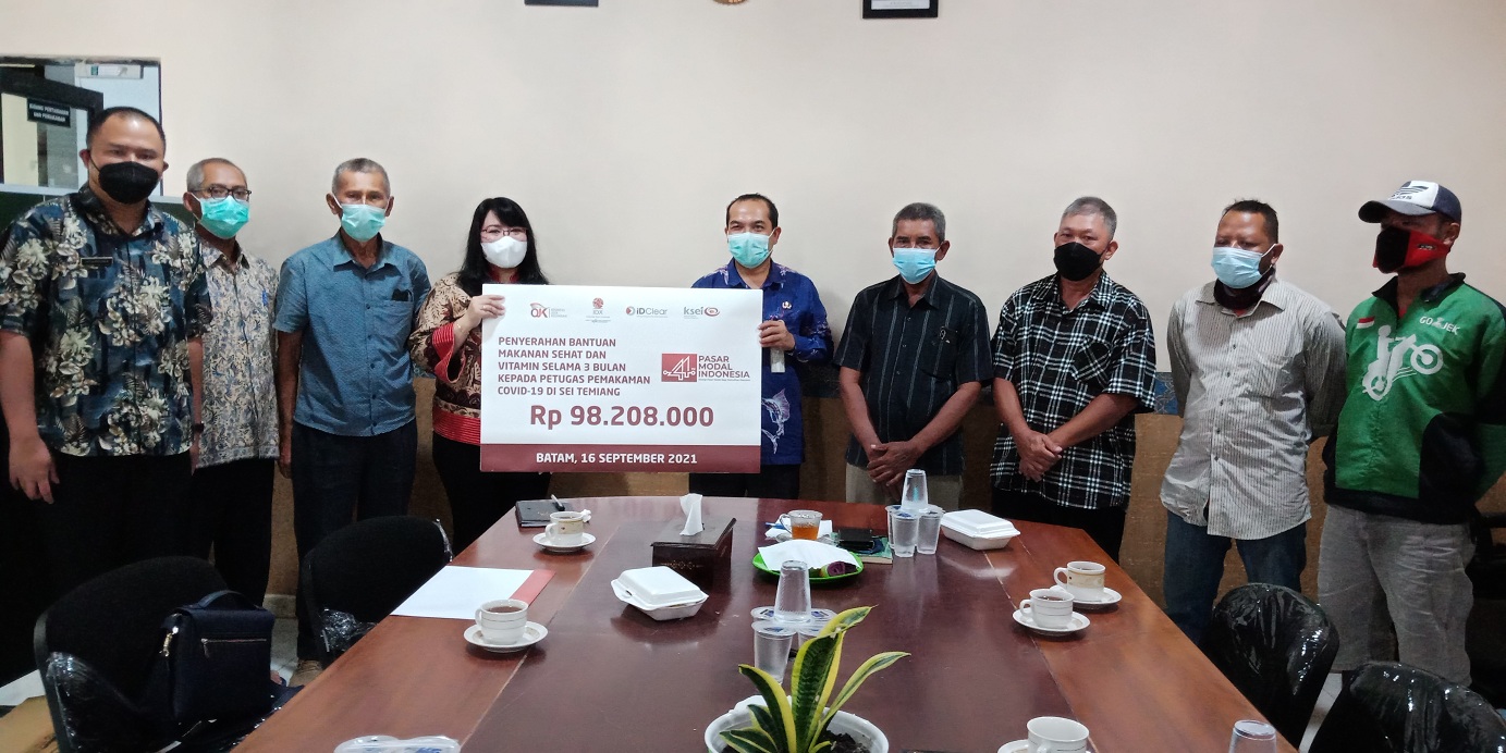 Penyerahan bantuan makanan sehat dan vitamin kepada petugas pemakaman Covid-19 di Sei Temiang secara simbolis diserahkan oleh P.H. Kepala Kantor Perwakilan BEI Kepulauan Riau, Indra Novita kepada Kepala Dinas Perumahan Rakyat, Pemukiman dan Pertamanan Kota Batam yang diwakili oleh Kepala Bidang Pertamanan dan Pemakaman, Irwan Saputra bertempat Kantor Dinas Perumahan Rakyat, Pemukiman dan Pertamanan Kota Batam, Sei Harapan, Sekupang. Dalam kegiatan ini perseroan memberikan bantuan makanan sehat (makan siang) dan vitamin yang dikirimkan secara langsung kepada 32 orang petugas pemakaman Covid-19 di Sei Temiang setiap hari selama 3 bulan (90 hari) dimulai sejak tanggal 16 September 2021. Pemberian makanan sehat dan vitamin ini diharapkan dapat membantu meningkatkan kesehatan dan imunitas tubuh para petugas pemakaman yang bertugas menguburkan jenazah pasien Covid-19.