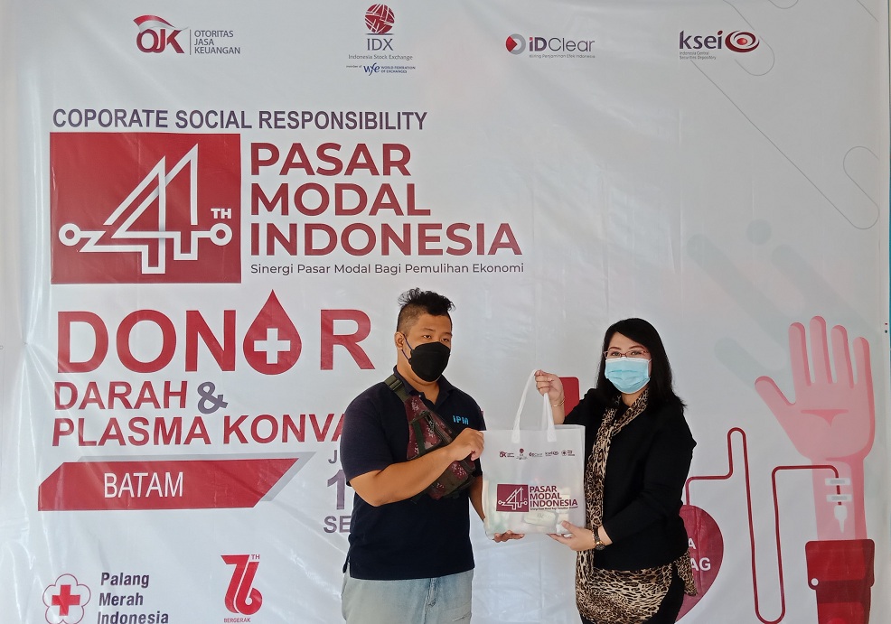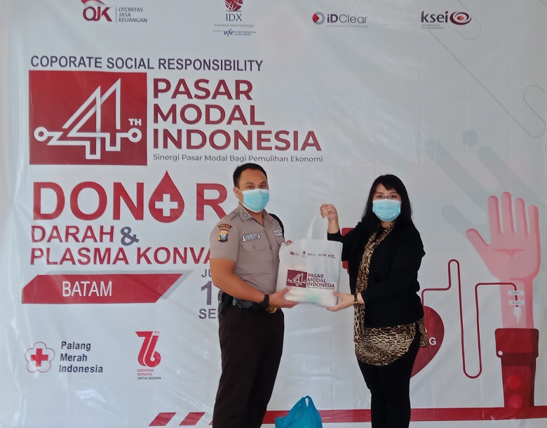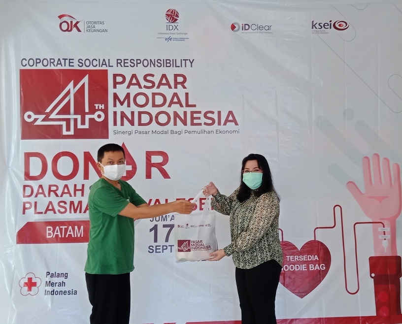 BATAM – 16-18 September 2021, Dalam rangka memperingati 44 Tahun Diaktifkannya Kembali Pasar Modal Indonesia, PT Bursa Efek Indonesia (BEI), PT Kliring Penjaminan Efek Indonesia (KPEI), dan PT Kustodian Sentral Efek Indonesia (KSEI) yang didukung oleh Otoritas Jasa Keuangan (OJK) telah melaksanakan beberapa rangkaian kegiatan CSR (Corporate Social Responsibility) diantaranya adalah pemberian bantuan makanan sehat dan vitamin kepada petugas pemakaman Covid-19 di Sei Temiang, Kota Batam yang telah dilaksanakan pada tanggal 16 September 2021, dilanjutkan dengan penyerahan santunan kepada 1 orang ahli waris Nakes yang gugur melawan Covid-19 di Kepulauan Riau pada tanggal 17 September 2021 serta kegiatan Donor Darah dan Donor Plasma Konvalesen pada tanggal 17-18 September 2021.