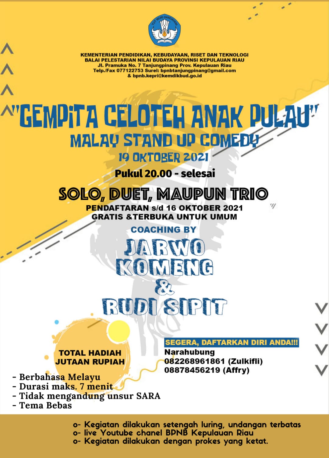 TANJUNGPINANG – Bagi warga Kepri yang memiliki bakat atau talenda stand up Komedi ada baiknya mengasah kemampuan di Lomba yang digelar Balai Pelestarian Nilai Budaya (BPNB) Kepri. Lomba yang mengangkat tema “Gempita Celoteh Anak Melayu” ini memperlombakan stand up komedi dengan peserta bisa solo, duet atau trio. Panitia akan menghadirkan artis-artis yang terkenal kocak yang sering tampil di layar televisi. Di antaranya Jarwo, Komeng dan Rudi Sipit. Hadiah untuk pemenangnya ada jutaan rupiah.