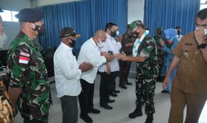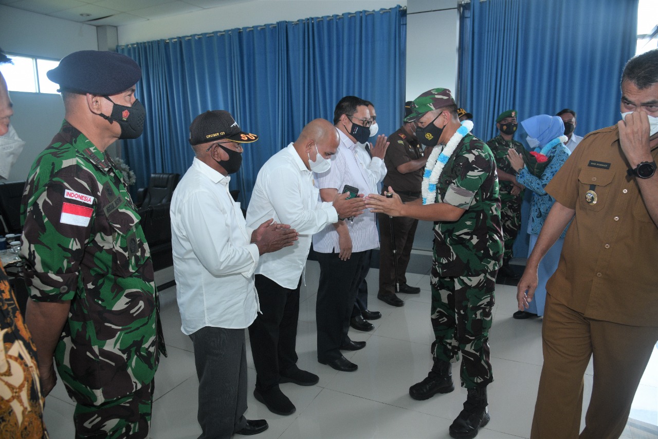 Tanpak hadir Bupati Natuna, Wan Siswandi bersama pimpinan FKPD menyambut kedatangan Kolonel Pnb Jajang Setiawan setelah menggantikan Kolonel Pnb Dedy S Salam.