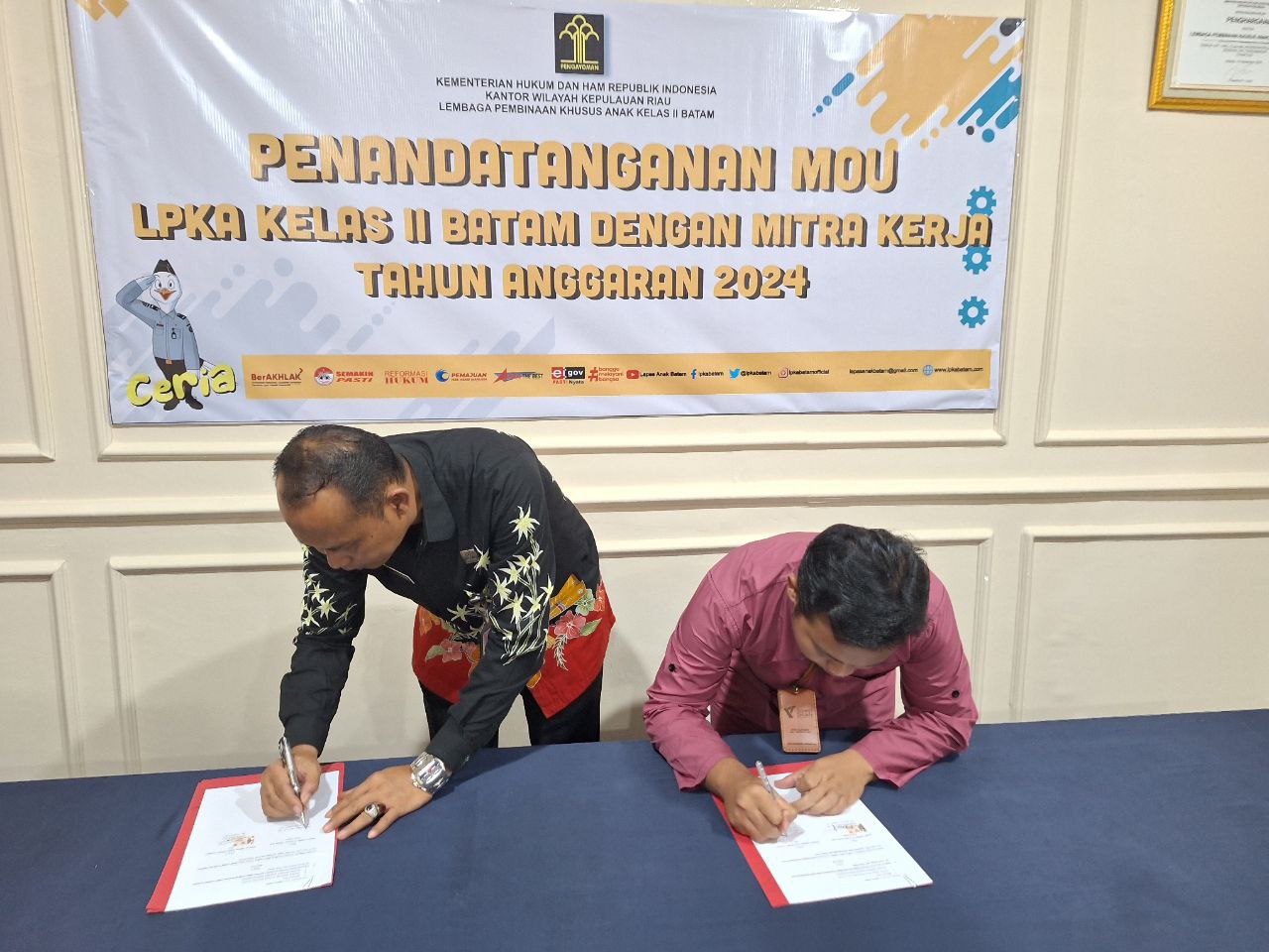 BATAM – Pimpinan Dompet Dhuafa Kepri Didik Supriyanto menandatangani MoU bersama Kepala LPKA Kelas II Batam, Bapak Agus Salim.,Amd.IP.,SH.,MH tentang program pembinaan kepribadian untuk penghuni LPKA Batam.