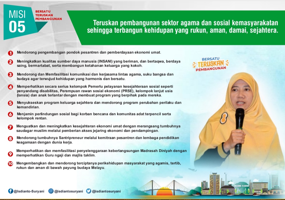 Menurutnya, dua misi yang tertuang dalam visi kelima teruskan pembangunan sektor agama dan sosial kemasyarakatan sehingga terbangun kehidupan yang rukun, aman, damai dan sejahtera adalah bukti komitmen Isdianto-Suryani untuk pesantren dan santri.