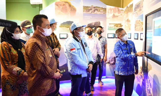 Di dalam gedung Menteri Johnny dan Gubernur Ansar melihat informasi yang disajikannya melalui maket-maket dan ilustrasi yang tersedia. Salah satu yang menarik perhatian Menteri Johnny adalah energi terbarukan melalui pemanfaatan gelombang air laut yang memiliki potensi energi sebesar 101.753 watt.