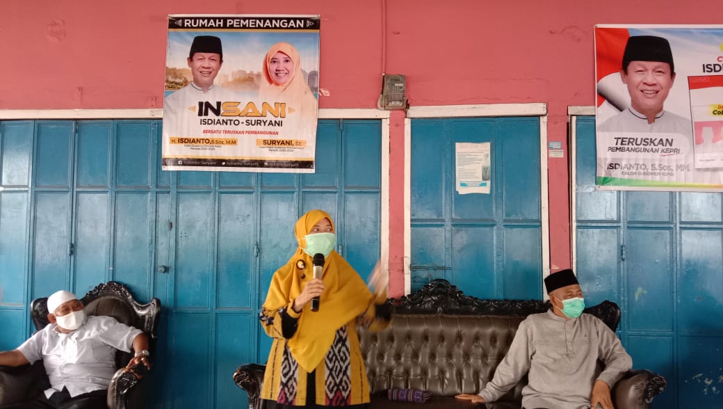 Tanjungpinang — Jumat (23/10/2020) Suryani Calon Wakil Gubernur Kepri nomor urut 2 giliran menyapa warga Tanjung Unggat, Bukit Bestari, Kota Tanjungpinang, dalam agenda kampanye. Dalam kampanye tatap muka tersebut, warga berharap adanya rumah tahfidz. Menurut Suryani bersama Pak Isdianto dirinya komitmen untuk membangun satu kecamatan satu rumah tahfidz.