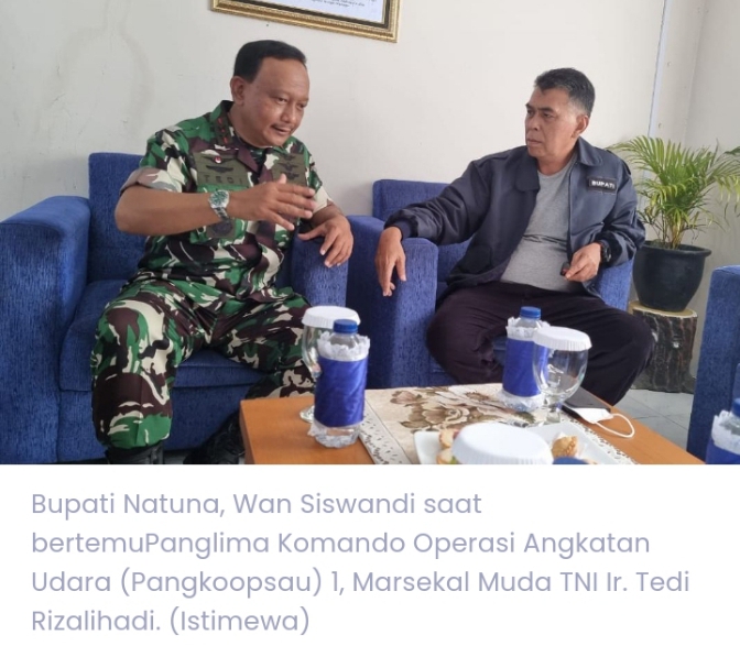 Saat orang nomor satu di Kabupaten Natuna tersebut berjumpa Panglima Komando Operasi Angkatan Udara (Pangkoopsau) 1, Marsekal Muda TNI Ir. Tedi Rizalihadi, Wan Siswandi menyampaikan keinginan tersebut di Ruang VIP Lanud Raden Sadjad, Ranai, Jumat 25 Maret 2022.
