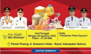 Natuna – (Siberindo.co)- Pemerintah daerah kabupaten Natuna akan melaksanakan bazar murah yang diperuntukan untuk pelaku UMKM serta menjualkan barang bahan pokok sembako dari bantuan pemerintah Pusat dan Provinsi.