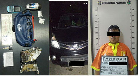 ″Dari Informasi dari Masyarakat itu dan dilakukan pengembangan. Tim opsnal Subdit III DitresNarkoba Polda Kepri mengeledah DK saat ia berada di Pintu keluar Pasar Aviari. Saat digeledah, ada barang bukti berupa 1 bungkus plastik hitam yang di dalamnya terdapat tas pinggang berwarna biru Merk Groovy. Di dalam tas itu ada berisikan Alumunium Foil dan terdapat 1 bungkus sabu seberat 443 gram. Kita juga mengamankan 1 unit Handphone, 1 unit Mobil Daihatsu Xenia,” kata Kabid Humas Polda Kepri Kombes Pol Harry Goldenhardt S.
