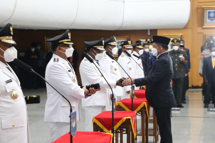 JAKARTA – – Menteri Dalam Negeri (Mendagri) Muhammad Tito Karnavian melantik lima Penjabat (Pj) kepala daerah dan satu wakil bupati di Papua. Mereka yang dilantik tersebut di antaranya Pj. Bupati Sarmi Markus Oktovianus Mansnembra, Pj. Bupati Mappi Michael Gomar, Pj. Bupati Nduga Namia Gwijangge, Pj. Bupati Lanny Jaya Petrus Wakerkwa, Pj. Wali Kota Jayapura Frans Pekey, dan Wakil Bupati Biak Numfor Calvin Mansnembra. Pelantikan berlangsung di Gedung Sasana Bhakti Praja Kantor Pusat Kemendagri, Jumat (27/5/2022).