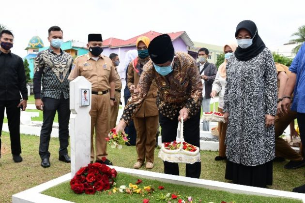 Saat ziarah di TMP, Isdianto didampingi istri almarhum H Muhammad Sani, Hj Aisyah Sani. Hadir juba Sekdaprov H TS rid Fadillah dan Ketua Dharma Wanita Persatuan Kepri Hj Rismarini Arif Fadillah. Keluarga besar H Subakir, dan sejumlah kepala OPD juga hadir.