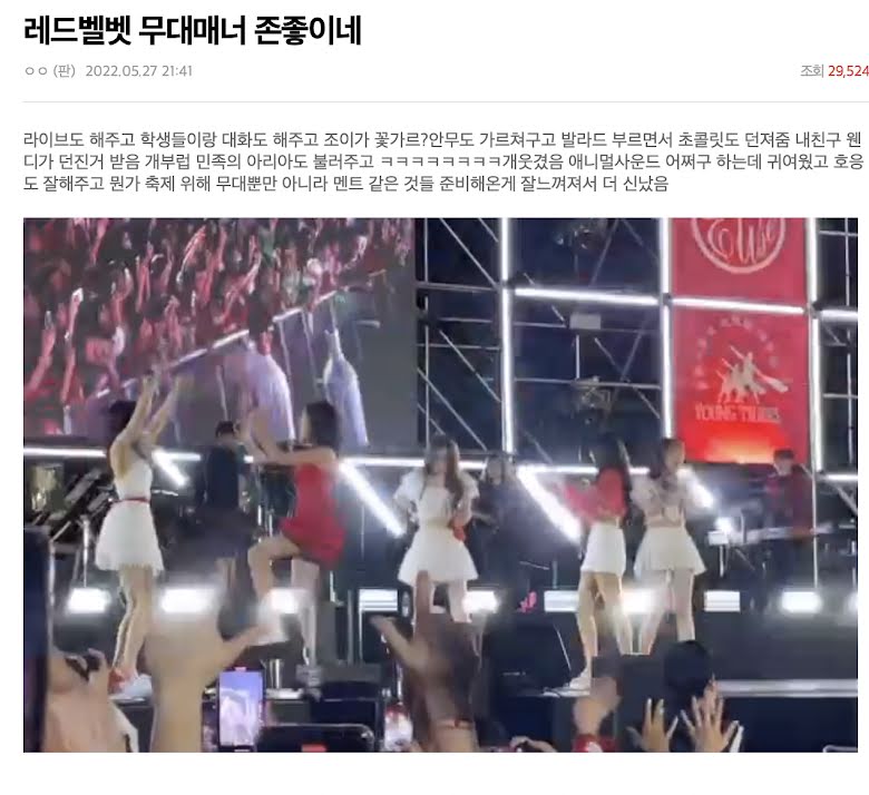 “Mereka tampil live dan juga berbincang dengan para siswa dan Joy bahkan mengajarkan gerakan tarian untuk perannya dalam “Feel My Rhythm”. Mereka membagikan cokelat sambil menyanyikan lagu balada dan saya sangat iri dengan teman saya yang menangkap satu dari Wendy.Mereka bahkan menyanyikan Minjok’s Aria (lagu sorakan sekolah Universitas Korea) Itu sangat lucu. Mereka juga lucu ketika mereka melakukan suara binatang dan mereka pandai menghipnotis orang banyak. Rasanya seperti mereka tidak hanya mempersiapkan pertunjukan tetapi juga apa yang harus dikatakan di antaranya sehingga semua orang lebih bersemangat,” kicau Warganet. (*/arl)